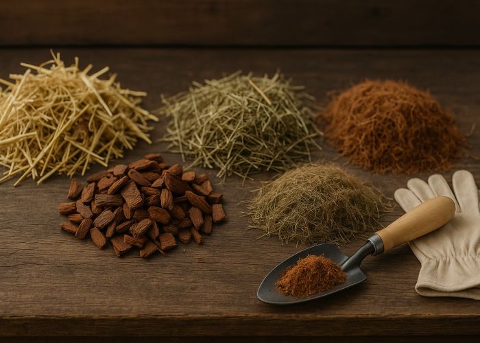 - Мульча — барьер против перегрева. Слой в 5–8 см из сена, соломы, кокосового волокна или коры существенно снижает нагрев верхнего слоя почвы и удерживает влагу. Обязательно укладывается после пролива — иначе эффект будет минимальный.