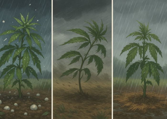 Летняя непогода воздействует на каннабис по нескольким направлениям одновременно: физиологическому, механическому и микробиологическому. Причем чем выше стадия развития растения, тем чувствительнее оно становится к колебаниям внешней среды. Основные климатические риски включают: